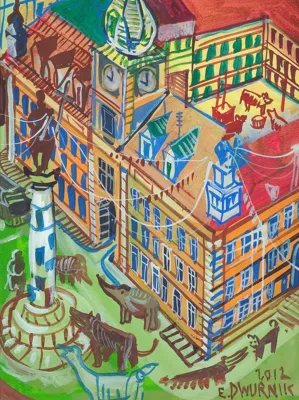 Edward Dwurnik (Radzymin 19 IV 1943 - Warszawa 28 X 2018) studiował malarstwo w ASP w Warszawie (1963-1970), jednak jako swego „mistrza“ wymienia Nikifora. Jego to prace, zobaczone po raz pierwszy w 1965, zainspirowały ówczesnego studenta III roku do narysowania pierwszych prac z cyklu „Podróże autostopem“, które kontynuował w nastepnych latach. W 1972-1978 powstawał cykl „Sportowcy“, w którym portretowane były, dodajmy - kąśliwie, typowe postaci z lat 70. Równolegle od 1975 powstawał cykl „Robotnicy“, który kulminował w okresie „Solidarności“ 1980-1981. Za prace z tego cyklu Dwurnik otrzymał w 1981 Nagrodę Krytyki Artystycznej im. Cypriana Kamila Norwida, natomiast za obrazy z cyklu „War...