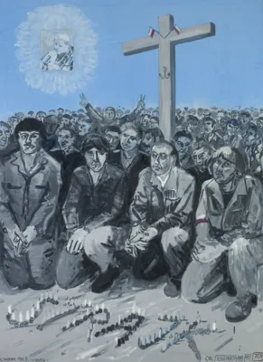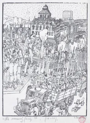 Edward Dwurnik (Radzymin 19 IV 1943 - Warszawa 28 X 2018) studiował malarstwo w ASP w Warszawie (1963-1970), jednak jako swego „mistrza“ wymienia Nikifora. Jego to prace, zobaczone po raz pierwszy w 1965, zainspirowały ówczesnego studenta III roku do narysowania pierwszych prac z cyklu „Podróże autostopem“, które kontynuował w nastepnych latach. W 1972-1978 powstawał cykl „Sportowcy“, w którym portretowane były, dodajmy - kąśliwie, typowe postaci z lat 70. Równolegle od 1975 powstawał cykl „Robotnicy“, który kulminował w okresie „Solidarności“ 1980-1981. Za prace z tego cyklu Dwurnik otrzymał w 1981 Nagrodę Krytyki Artystycznej im. Cypriana Kamila Norwida, natomiast za obrazy z cyklu „War...