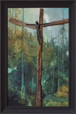 olej, płyta pilśniowa, drewno, figura Chrystusa - 101 x 63cm