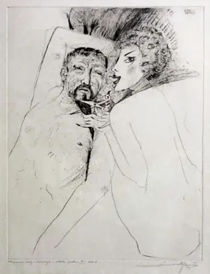 Leszek Rózga (Zgierz 1924 - Łódź 2015) - artysta grafik. W latach 1940-1945 przebywał na robotach w Niemczech, gdzie po zakończeniu wojny pracował w teatrze amatorskim i uczył się prywatnie malarstwa (1945-1947). Studiował w Państwowej Wyższej Szkole Sztuk Plastycznych w Łodzi (1948-1951) i na Wydziale Grafiki Propagandowej w Katowicach - filii ASP w Krakowie, gdzie obronił dyplom w 1954. W latach 1967-1994 był wykładowcą (od 1979 profesorem) w uczelni łódzkiej, gdzie stworzył szkołę metaforycznej, ekspresyjnej sztuki graficznej. Brał udział w licznych wystawach w kraju i za granicą, zdobywając często nagrody. Był również laureatem wielu nagród państwowych, resortowych, regionalnych itp., jak: Nagrody Ministra Kultury i Sztuki I st. 1981, 1986, 1994, Nagroda Woj. Łódzkiego 1972, Nagroda Miasta Łodzi 1985. Działał w ZPAP, był m. in. członkiem Rady Artystycznej Zarządu Głównego 1974-1976. Początkowo zajmował się głównie malarstwem, rysunkiem i monotypią, tworząc nastrojowe widoki miejskie. Od 1960 skupił się na grafice warsztatowej (głównie w technikach metalowych). W latach 70. wprowadzał do swych kompozycji werystycznie odwzorowane rośliny i owoce, inskrypcje, cytaty ze sztuki klasycznej.