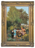 Wg ekspertyzy dr. Lankau, zamieszczonej na odwrocie obrazu, artysta przedstawił na nim fragment ogrodu przy swoim dworze na krakowskich Dębnikach (por.: Dworek w Dębnikach, 1883). Scena przedstawia leciwego...