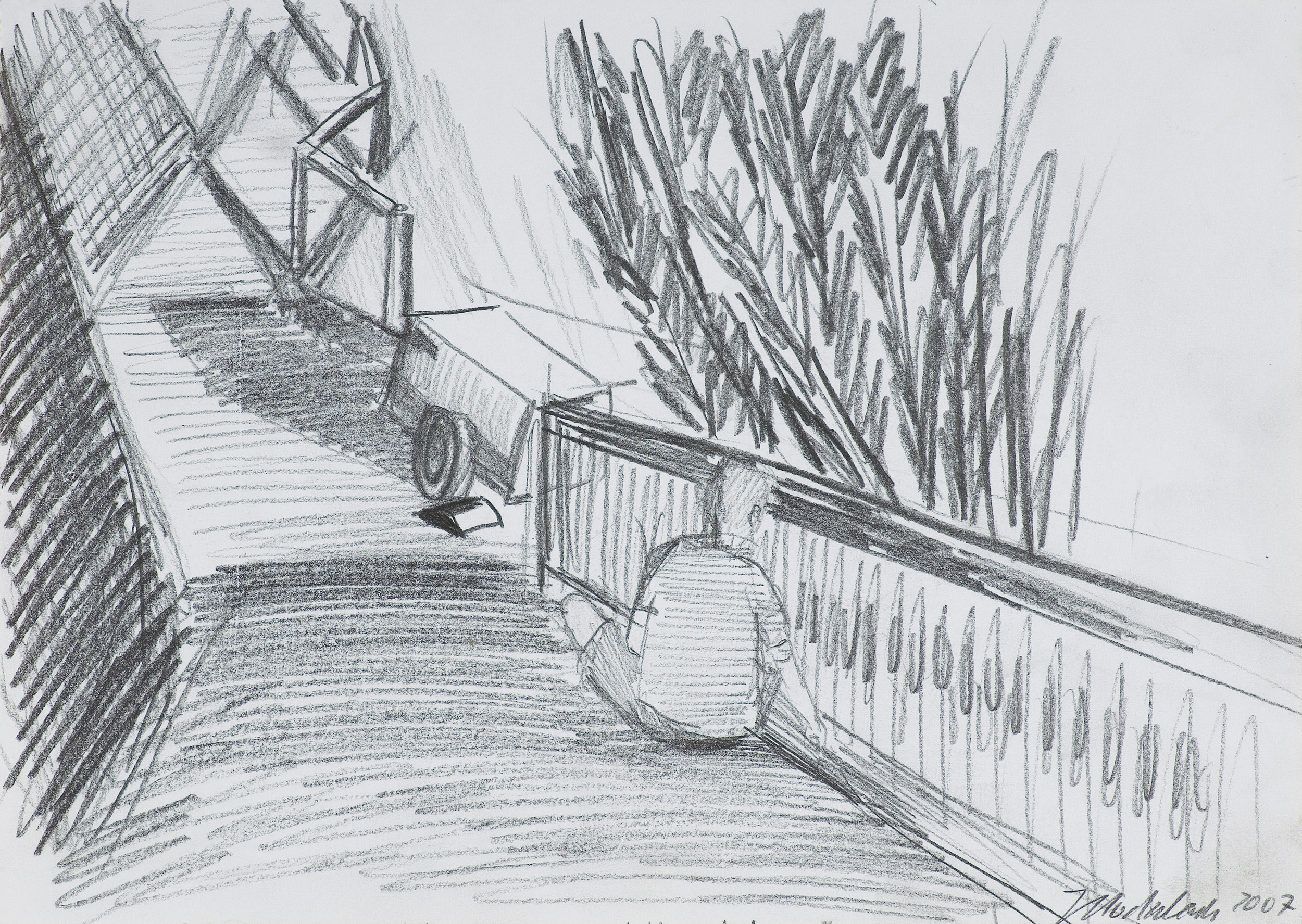 Szkic wykonany podczas pleneru w Vellano w Toskanii, na który corocznie od 2004 roku zapraszał artystów właściciel posiadłości, Krzysztof Musiał. Przy balustradzie siedzi 5-letni Prot, syn artysty.