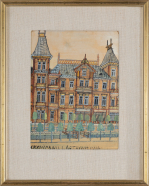 Artysta z pedantyczną dbałością kreślił ciemnymi liniami kontury budynków i detali (okien, płotów, dachów), wyostrzając je i...
