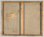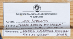 Na górnej listwie ramy naklejka (druk, czarny flamaster): MUZEUM IM. JACKA MALCZEWSKIEGO W RADOMIU | AUTOR: JAN RUBCZAK | TYTUŁ: „PEJZAŻ Z DROGĄ POD LASEM“ | TECHNIKA I WYMIARY: OL.PŁ., 54×65,5 | WYSTAWA: „GALERIA MALARSTWA POLSKIEGO XIX I XX WIEKU“ 2008 R.