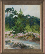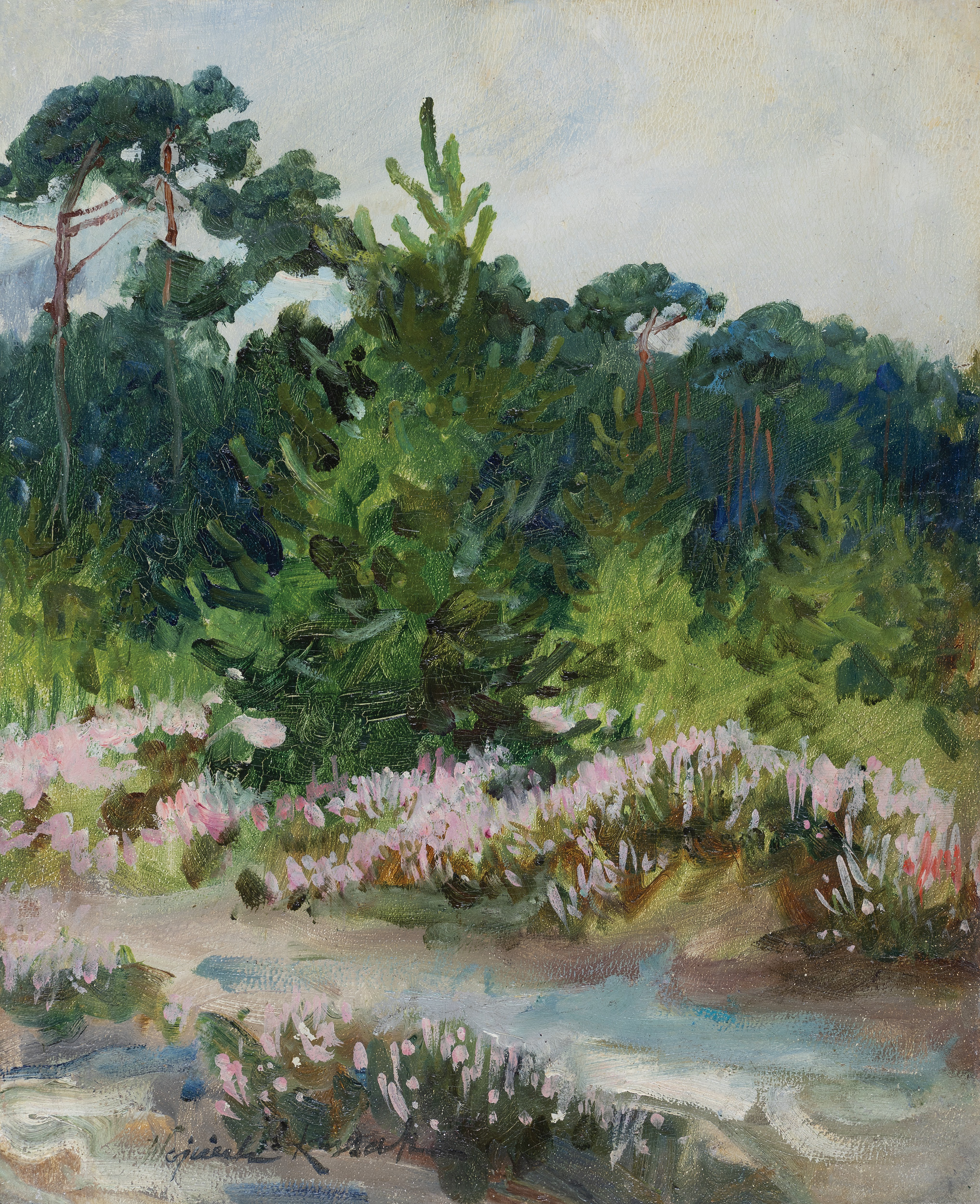 Prezentowany pejzaż z wrzosami stanowi notatkę artysty, którą następnie wykorzystywał jako tło rozbudowanych kompozycji (np. Ułan z luzakiem, 1927, aukcja Agra-Art w czerwcu 2019).