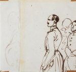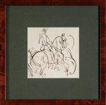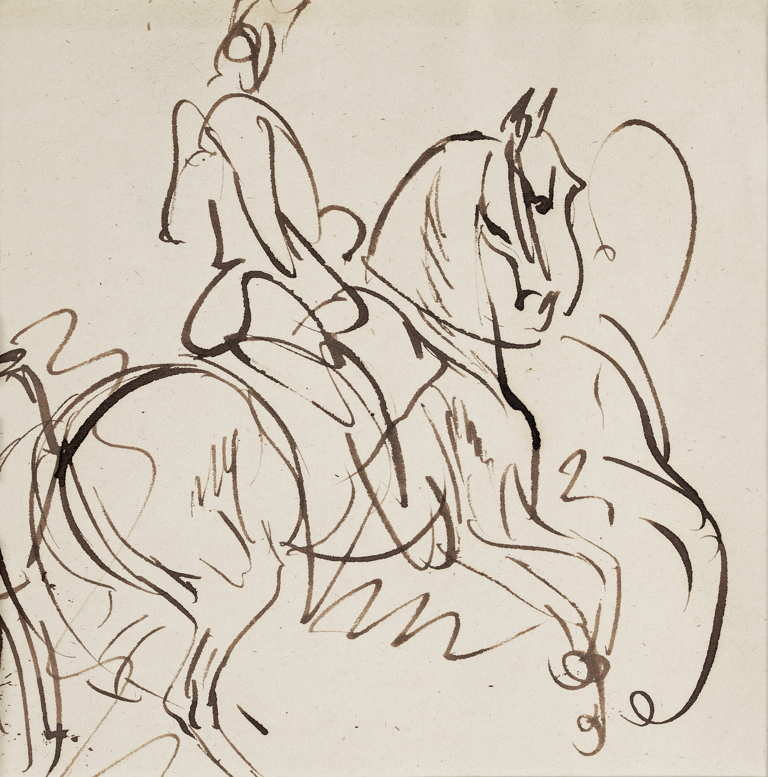 Rysunek przedstawia szkic jeźdźca i dwóch oficerów. W świetle passe-partout widoczna jest kompozycja z jeźdźcem. Pozostała część szkicu została zawinięta i widoczna jest na odwrocie.