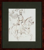 Rysunek przedstawia szkic jeźdźca i obliczenia rachunkowe. Na odwrocie postać jeźdźca na koniu. Część kartki zawinięta.