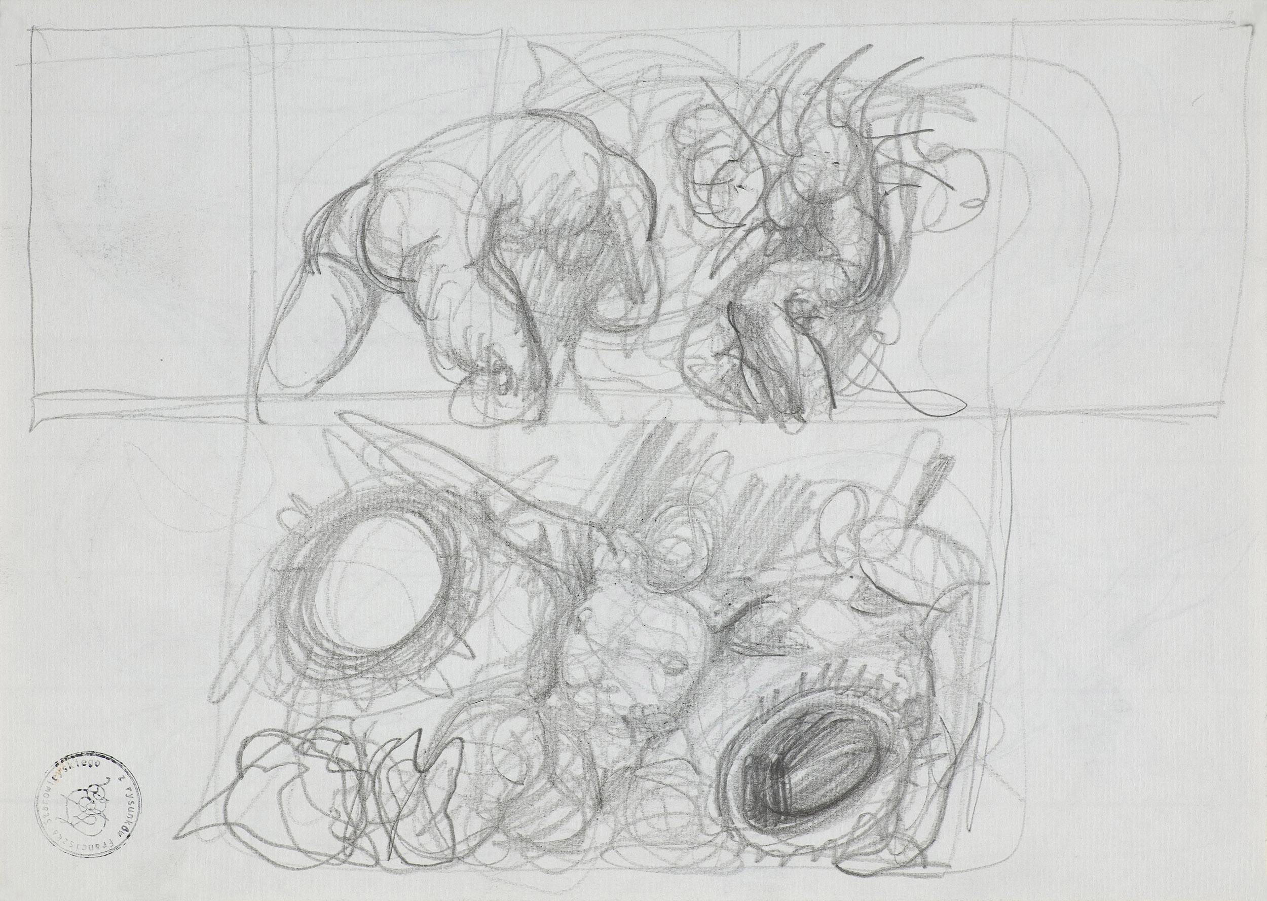 l.d. okrągła pieczątka z faksymile sygnatury artysty (monogram wiązany) i napisem w otoku: Z rysunków Franciszka Starowieyskiego