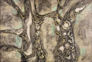 tusz pióro, pędzel, karton z suchą pieczęcią