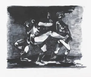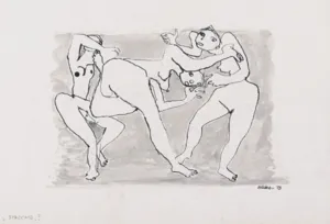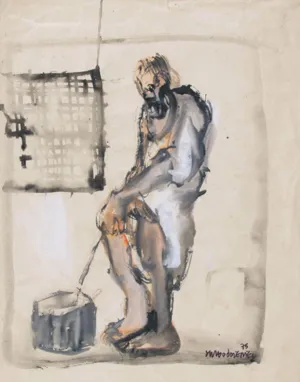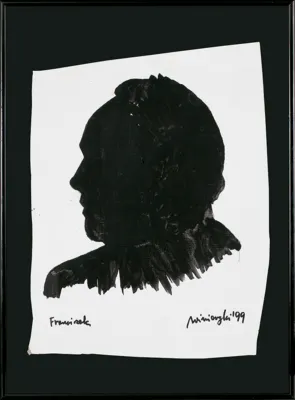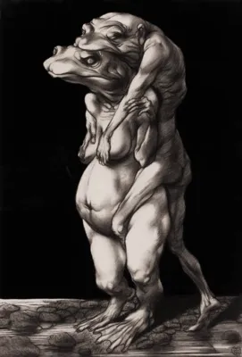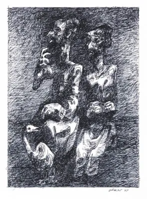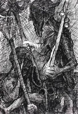 kredka czarna, tusz pędzel, papier krem.