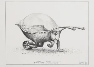 tusz pióro, akw. na białym gruncie, deska, sznure