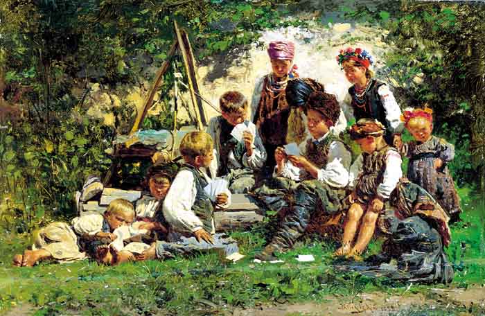 Władymir Jegorowicz Makowski – wybitny rosyjski malarz scen rodzajowych, także portrecista - syn Jegora Iwanowa Makowskiego, jednego z założycieli Moskiewskiej Klasy Artystycznej, brat malarza Konstantego J. Makowskiego. W latach 1861-1866 studiował u S. K. Zarjanki i J. S. Sorokina w moskiewskiej Szkole Malarstwa, Rzeźby i Budownictwa, w której później (1881-1894) sam pracował jako nauczyciel. Jego obrazy pokazywane na wystawach kilkakrotnie zostały odznaczone medalami, m.in. w roku 1869 wielkim złotym medalem nagrodzono obraz Wiejscy chłopcy pilnujący koni. W 1873 artysta otrzymał tytuł akademika, a od 1894 do 1918 był profesorem i kierownikiem pracowni malarstwa rodzajowego Wyższej Szkoły Artystycznej przy Akademii Sztuk Pięknych w Petersburgu. Makowski malował sceny z codziennego życia rosyjskich chłopów i mieszczan, które wyróżniają się realizmem, bystrością obserwacji, świetną charakterystyką postaci a często także zabarwieniem humorystycznym (Na bulwarze, 1886-87, Galeria Trietiakowska w Moskwie). Chętnie malował dzieci, traktując małych modeli z wyczuwalną sympatią. Zajmował się również akwarelą, ilustracją książkową (m.in. utwory M. W. Gogola) i grafiką. Od 1871 uczestniczył w wystawach Towarzystwa Ruchomych Wystaw Artystycznych (tzw. pieriedwiżników), wystawiał też za granicą, m.in. w Wiedniu i Berlinie.