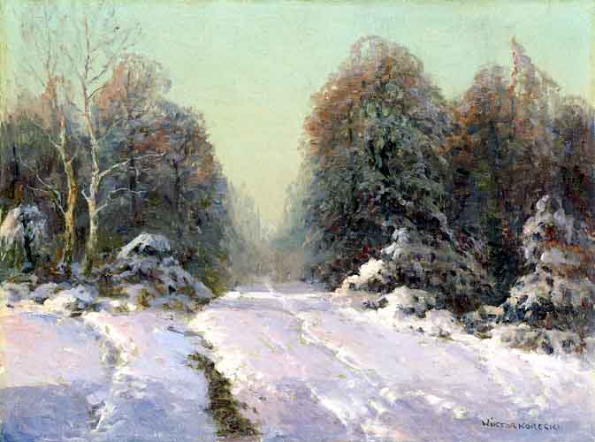 Wiktor Korecki (Kamieniec Podolski 1890 - Komorów k. Warszawy 1980) - malarz pejzażysta - gimnazjum ukończył w Kijowie, tam też studiował w Szkole Rysunkowej Aleksandra Muraszki. Po studiach wrócił do Kamieńca Podolskiego, skąd w roku 1921 wyjechał do Warszawy. Tu miał pracownię na rogu ulic Tamki i Cichej. Niestety zgromadzone tam obrazy spłonęły w czasie powstania 1944 roku. Po powstaniu artysta przebywał w obozie w Pruszkowie skąd trafił do obozu pracy w Lipsku. Do kraju powrócił w roku 1946 i zamieszkał w Komorowie pod Warszawą, a później w Milanówku. Jego nastrojowe krajobrazy emanujące spokojem i pogodą cieszyły się zawsze dużą popularnością. Korecki najczęściej malował pejzaże zimowe z motywem leśnej drogi i strumienia wijącego się wśród śniegów, a obok nich także wiosenne, letnie czy jesienne widoki z Mazowsza.