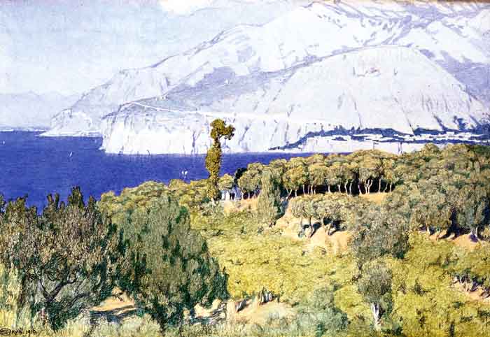Edward Okuń (Wólka Zerzyńska /obecnie Zerzeńska/ k. Warszawy 1872 - Skierniewice 1945) – malarz, rysownik, ilustrator – studia artystyczne rozpoczął w warszawskiej Klasie Rysunkowej u Wojciecha Gersona. W latach 1891-1893 kształcił się w krakowskiej Szkole Sztuk Pięknych, m.in. u Jana Matejki, od 1893 w Monachium u Antona Ažbe, Stanisława Grocholskiego i Szymona Hollosy’ego. Studia uzupełniał w Paryżu. Od roku 1898 stale mieszkał we Włoszech – w Rzymie, a okresowo także w pobliskim Anticoli Corrado, we Florencji, Sorrento, Amalfi i na Capri. W 1914 podróżował do Egiptu. W roku 1921 wrócił do Warszawy, gdzie w latach 1925-1930 był profesorem Szkoły Sztuk Pięknych. Jeszcze kilkakrotnie wyjeżdżał do Włoch (m.in. w 1928, 1937, 1938), a w latach 1927 oraz 1929-1932 jeździł do Jugosławii, gdzie powstał cykl pejzaży Znad Adriatyku - "Jadran". Malował dekoracyjne, stylizowane portrety, idylliczne pejzaże i kompozycje o wątkach fantastycznych i baśniowych, bliskie symbolizmowi i secesji. Często sam projektował ramy do swoich obrazów, traktując je jako integralną część tych dzieł. Był wybitnym twórcą grafiki książkowej; wykonywał ilustracje, winiety, projekty okładek, inicjały i przerywniki, współpracując m.in. z warszawskim pismem „Chimera”.