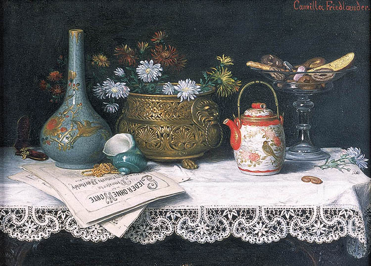 Camilla Friedlaender - austriacka malarka martwych natur - początkowo uczyła się pod kierunkiem ojca malarza Friedricha Friedlaendera, następnie kształciła się w Paryżu. W roku 1901 wstąpiła do klasztoru salezjanek w Wiedniu, całkowicie porzucając malarstwo. Jej obrazy to wyłącznie martwe natury z anty-kami, kwiatami, owocami - kompozycje o niewielkich rozmiarach, malowane z miniatorska precyzją. Prace artystki znajdują się, m.in. w muzeach Pragi i Wiednia oraz w licznych zbiorach prywatnych.