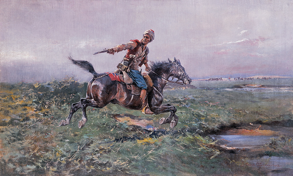 Tadeusz Ajdukiewicz (Bochnia 1851 - Kraków 1916) był artystą związanym z mecenatem arystokracji i dworów panujących; w tych kręgach zrobił prawdziwą karierę, a jego obrazy podobały się powszechnie. Studia malarskie rozpoczął w krakowskiej Szkole Sztuk Pięknych. Później kształcił się jeszcze w Wiedniu oraz w Monachium - w Akademii i w pracowni Józefa Brandta. Po studiach przez kilka lat jeździł po polskich dworach kresowych i malował portrety. Około 1877 wyjechał do Paryża, skąd, wraz z Władysławem Branickim wyjechał w – ważną dla jego przyszłej twórczości – podróż na Bliski Wschód. Około roku 1882 zamieszkał w Wiedniu, zajął pracownię po Hansie Makarcie (zm. 1884), malując dla dworu cesarskiego i arystokracji. W 1893 bawił w Londynie, gdzie, m.in. portretował księcia Walii, w 1894 pracował na dworze sułtańskim w Konstantynopolu, następnie także w Sofii, Petersburgu i Bukareszcie. W Rumunii osiadł na dłużej jako malarz nadworny Karola I. Po wybuchu I wojny światowej powrócił do kraju i, mimo starszego wieku, zaciągnął się do Legionów. Zmarł, nie wytrzymawszy trudów wojennych. Malował przede wszystkim portrety - zarówno reprezentacyjne, efektowne i eleganckie (Portret Heleny Modrzejewskiej, MNK), jak również skromne i kameralne. Tworzył też sceny myśliwskie, obrazy o tematyce wschodniej, bohaterskie sceny bitewne, rewie i przeglądy wojsk (Przegląd armii rumuńskiej, 1896).