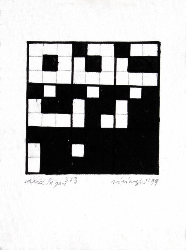 Ryszard Winiarski (Lwów 1936 - Warszawa 2006) ukończył w 1959 Politechnikę Warszawską i podjął studia malarskie w ASP w Warszawie (1960-1966). Pod koniec studiów, w 1965 sformułował własny program artystyczny i zrealizował pierwsze prace z serii pt. „Próby wizualnej prezentacji rozkładów statystycznych“. Otrzymał za nie I nagrodę na Sympozjum Artystów i Naukowców w Puławach w 1966. Jako stałe moduły prac przyjął kwadraty w kolorach czerni i bieli, których kolejnością i rozmieszczeniem rządzi przypadek - rzut kostką do gry, losowanie lub wybór liczb przypadkowych. W 1970 wprowadził do swych prac trzeci wymiar w formie obrazów przestrzennych lub jako iluzję przestrzeni uzyskaną przez wykreślanie perspektywy linearnej. W 1971 powstały pierwsze obrazy z wmontowanymi lustrami. Od 1972 artysta aranżował też „gry“ z udziałem widzów, którzy stosując jego środki i metodę wypełniali płaszczyznę czy pomieszczenie własną „wystawą“. Od ok. 1983 Winiarski włączył do swych prac elementy znaczeniowe, symboliczne i odwołujące się do emocji, jak kształt krzyża, naturalne materiały i zabiegi na nich, np. gięcie (instalacje: Geometria w stanie napięcia, 1984, Czarny kwadrat czyli fruwająca geometria, 1984, Hommage dla Henryka Stażewskiego, 1989). Równolegle artysta od 1960 uprawiał scenografię teatralną, będąc autorem kilkudziesięciu realizacji w tej dziedzinie w teatrach całej Polski. Uczestniczył w wielkiej liczbie wystaw w Polsce i za granicą, w tym: Biennale w Sao Paulo 1969, I i II Biennale des Konstruktivismus, Norymberga 1969 i 1971, Konstrukcja w procesie, Łódź 1981 i Monachium 1985. Zmarł 4 grudnia 2006 w Warszawie.