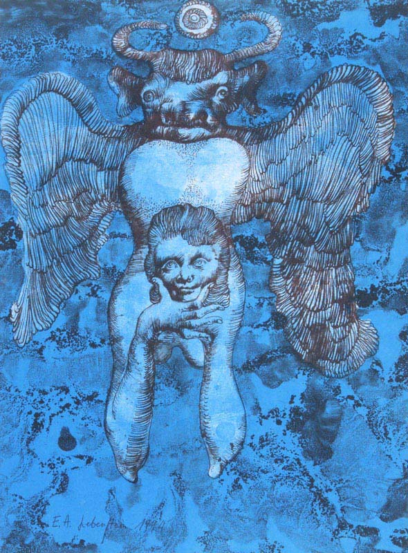 Jan Lebenstein (Brześć Litewski 1930 - Kraków 1999) w latach 1948-1954 studiował malarstwo w ASP w Warszawie pod kierunkiem prof. Eugeniusza Eibischa i Artura Nachta-Samborskiego. W 1955 wziął udział w wystawie w warszawskim Arsenale. Zaprzyjaźniony w czasie studiów z Mironem Białoszewskim, swą pierwszą wystawę indywidualną pokazał w 1956 w Teatrze na Tarczyńskiej. W 1959 zdobył Grand Prix de la Ville de Paris na I Biennale Młodych w Paryżu i w tym roku przeniósł się na stałe do Paryża. Po seriach "figur kreślonych" (na papierze milimetrowym) i "figur hieratycznych" z lat 1955-1958 maluje cykl "figur osiowych" (1958-1962), które wystawia w Paryżu i USA. Równolegle w 1960 zaczyna rysowane "karnety", rodzaj dziennika, który w przyszłości dostarczy motywów wykorzystanych w obrazach. W latach 1964-1965 maluje "Bestiarium", cykl fakturowych, archaizowanych stworów przypominających prehistoryczne wykopaliska. Bezpośrednio po nich wprowadza do swych obrazów postaci ludzkie i fantastyczne, odgrywające sceny ni to mitologiczne, ni to ze snu, często przesycone erotyką. W 1970 projektuje witraże dla Centre du Dialogue w Paryżu. W W 1971 otrzymuje obywatelstwo francuskie 1974 powstają gwasze inspirowane Folwarkiem zwierzęcym George'a Orwella. W latach 1976-1989 tworzy wyłącznie w technice gwaszu i pastelu, podejmując tematykę mitologiczną i zaczerpniętą z Biblii: cykle ilustracji do Księgi Hioba (wyd. 1979) i do Apokalipsy (wyd. 1986) w nowych przekładach Czesława Miłosza. W 1989 powraca do malarstwa olejnego (cykl "Pergamon"). Artysta otrzymał m. in. nagrodę Fundacji im. Alfreda Jurzykowskiego w 1976, Nagrodę Muzeum Archidiecezji Warszawskiej w 1985, Nagrodę im. Jana Cybisa w 1987.