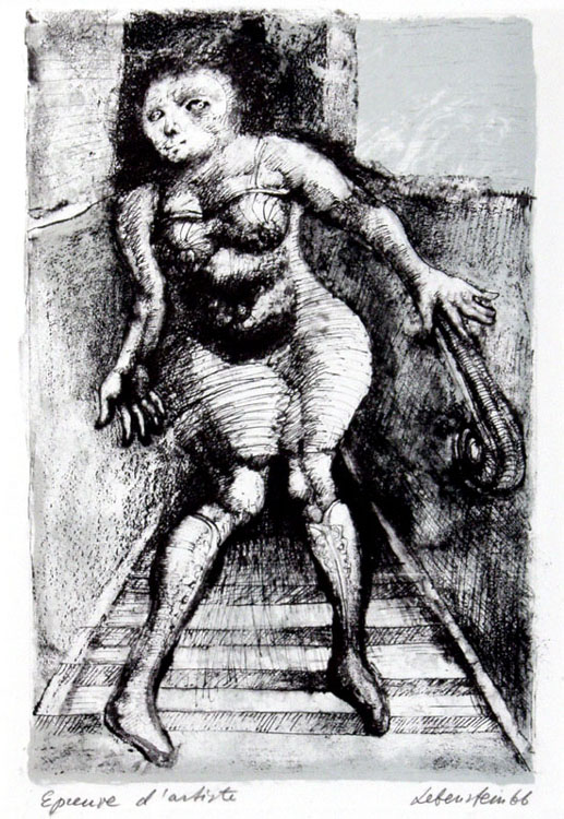 Jan Lebenstein (Brześć Litewski 1930 - Kraków 1999) w latach 1948-1954 studiował malarstwo w ASP w Warszawie pod kierunkiem prof. Eugeniusza Eibischa i Artura Nachta-Samborskiego. W 1955 wziął udział w wystawie w warszawskim Arsenale. Zaprzyjaźniony w czasie studiów z Mironem Białoszewskim, swą pierwszą wystawę indywidualną pokazał w 1956 w Teatrze na Tarczyńskiej. W 1959 zdobył Grand Prix de la Ville de Paris na I Biennale Młodych w Paryżu i w tym roku przeniósł się na stałe do Paryża. Po seriach "figur kreślonych" (na papierze milimetrowym) i "figur hieratycznych" z lat 1955-1958 maluje cykl "figur osiowych" (1958-1962), które wystawia w Paryżu i USA. Równolegle w 1960 zaczyna rysowane "karnety", rodzaj dziennika, który w przyszłości dostarczy motywów wykorzystanych w obrazach. W latach 1964-1965 maluje "Bestiarium", cykl fakturowych, archaizowanych stworów przypominających prehistoryczne wykopaliska. Bezpośrednio po nich wprowadza do swych obrazów postaci ludzkie i fantastyczne, odgrywające sceny ni to mitologiczne, ni to ze snu, często przesycone erotyką. W 1970 projektuje witraże dla Centre du Dialogue w Paryżu. W W 1971 otrzymuje obywatelstwo francuskie 1974 powstają gwasze inspirowane Folwarkiem zwierzęcym George'a Orwella. W latach 1976-1989 tworzy wyłącznie w technice gwaszu i pastelu, podejmując tematykę mitologiczną i zaczerpniętą z Biblii: cykle ilustracji do Księgi Hioba (wyd. 1979) i do Apokalipsy (wyd. 1986) w nowych przekładach Czesława Miłosza. W 1989 powraca do malarstwa olejnego (cykl "Pergamon"). Artysta otrzymał m. in. nagrodę Fundacji im. Alfreda Jurzykowskiego w 1976, Nagrodę Muzeum Archidiecezji Warszawskiej w 1985, Nagrodę im. Jana Cybisa w 1987.