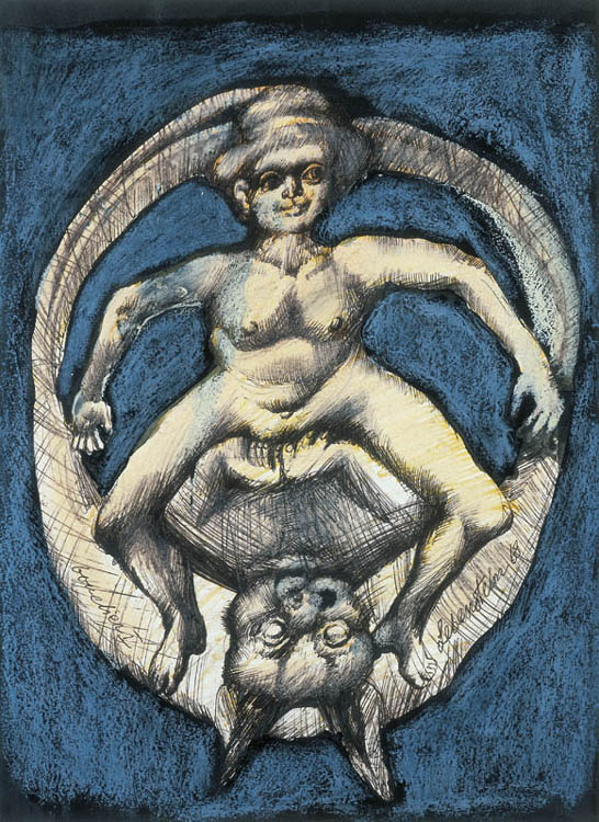 Jan Lebenstein (Brześć Litewski 1930 - Kraków 1999) w latach 1948-1954 studiował malarstwo w ASP w Warszawie pod kierunkiem prof. Eugeniusza Eibischa i Artura Nachta-Samborskiego. W 1955 wziął udział w wystawie w warszawskim Arsenale. Zaprzyjaźniony w czasie studiów z Mironem Białoszewskim, swą pierwszą wystawę indywidualną pokazał w 1956 w Teatrze na Tarczyńskiej. W 1959 zdobył Grand Prix de la Ville de Paris na I Biennale Młodych w Paryżu i w tym roku przeniósł się na stałe do Paryża. Po seriach "figur kreślonych" (na papierze milimetrowym) i "figur hieratycznych" z lat 1955-1958 maluje cykl "figur osiowych" (1958-1962), które wystawia w Paryżu i USA. Równolegle w 1960 zaczyna rysowane "karnety", rodzaj dziennika, który w przyszłości dostarczy motywów wykorzystanych w obrazach. W latach 1964-1965 maluje "Bestiarium", cykl fakturowych, archaizowanych stworów przypominających prehistoryczne wykopaliska. Bezpośrednio po nich wprowadza do swych obrazów postaci ludzkie i fantastyczne, odgrywające sceny ni to mitologiczne, ni to ze snu, często przesycone erotyką. W 1970 projektuje witraże dla Centre du Dialogue w Paryżu. W W 1971 otrzymuje obywatelstwo francuskie 1974 powstają gwasze inspirowane Folwarkiem zwierzęcym George'a Orwella. W latach 1976-1989 tworzy wyłącznie w technice gwaszu i pastelu, podejmując tematykę mitologiczną i zaczerpniętą z Biblii: cykle ilustracji do Księgi Hioba (wyd. 1979) i do Apokalipsy (wyd. 1986) w nowych przekładach Czesława Miłosza. W 1989 powraca do malarstwa olejnego (cykl "Pergamon"). Artysta otrzymał m. in. nagrodę Fundacji im. Alfreda Jurzykowskiego w 1976, Nagrodę Muzeum Archidiecezji Warszawskiej w 1985, Nagrodę im. Jana Cybisa w 1987.