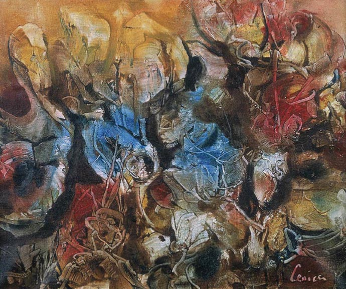 Alfred Lenica (Pabianice 1899 - Warszawa 1977) uczył się prywatnie rysunku i malarstwa w pracowniach Artura Hannytkiewicza i Piotra Kubowicza w Poznaniu (1925-1928). W latach 30. malował obrazy figuratywne, nawiązujące w stylistyce do kubizmu. Nieco później uległ wpływom surrealizmu, który, pomijając lata socrealizmu, stanie się dlań najpoważniejszym obszarem poszukiwań malarskich. Od połowy lat 40. utrzymywał stałe kontakty z kręgiem „Grupy Krakowskiej“, przyjaźnił się z Jerzym Kujawskim. Po przeniesieniu się do Poznania, w 1947 został współzałożycielem awangardowej grupy „4F+R“ (farba, forma, fantastyka, faktura + realizm). Jest autorem pierwszego polskiego obrazu taszystowskiego (Farby w ruchu, 1949, tempera). W okresie socrealizmu włączył się w nurt oficjalnej sztuki, pracując jednocześnie jako organizator życia artystycznego, prezes Okręgu Poznańskiego ZPAP (1948-1950) i jednocześnie kierownik Pracowni Sztuk Plastycznych tamże. W końcu lat 50. przeniósł się do Warszawy i również tu do 1969 pełnił kierownicze funkcje w ZPAP. W drugiej poł. lat 50. ponownie - po eksperymentach z lat 40. - uprawiał informel, malując chętnie techniką drippingu. Około 1958 wypracował indywidualny, charakterystyczny dlań styl wirujących, kolorowych, niekiedy kaligraficznie opracowanych form, które dynamicznie wypełniały pola obrazów. Tworzył je techniką zbliżoną do surrealistycznej dekalkomanii. Styl ten stał się znakiem rozpoznawczym artysty do końca życia. W swych obrazach nie unikał kształtów nawiązujących do form naturalnych (jego malarstwo nazywano „biologicznym“), a w latach 70. niekiedy włączał do kompozycji motywy figuralne. Wystawa retrospektywna artysty odbyła się w Galerii Zachęta w Warszawie w 1974.