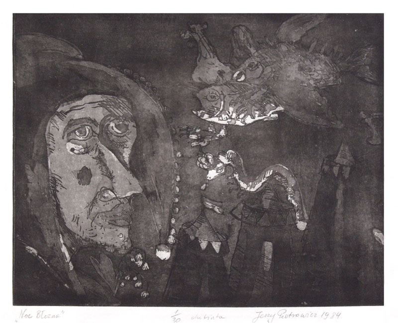 Jerzy Piotrowicz (Przedświt na Mazowszu 21 III 1943 – Poznań 30 X 1999) spędził młodość na Dolnym Śląsku (Jelenia Góra, Wrocław), skąd udał się na studia do PWSSP w Poznaniu. Malarstwa uczył się w pod kierunkiem prof. Mariana Szmańdy, dyplom z grafiki uzyskał w pracowni prof. Tadeusza Jackowskiego w roku 1972. Uprawiał malarstwo, grafikę i rysunek. Na przełomie lat 60. i 70. mieszkał w Wildze i tam stworzył cykl skrzydlatych, magicznych postaci nazwany „Anioły Wildeckie” Od lat 70. współtworzył szeroki nurt malarstwa zwany nową figuracją. Miał wiele wystaw indywidualnych, corocznie brał też udział w zbiorowych pokazach polskiej sztuki współczesnej m.in. w kolejnych edycjach Festiwalu Polskiego Malarstwa Współczesnego w Szczecinie w latach 1972-1980. W okresie stanu wojennego czynnie uczestniczył w ruchu kultury niezależnej. Duży wpływ wywarła na artyście podróż do Hiszpanii w 1986. Zainspirowany kulturą iberyjską namalował serię obrazów zatytułowaną „Infantki”. Jego prace charakteryzują się spotęgowaną ekspresją, niosą treści egzystencjalne i symboliczne, nie pozbawione groteski i liryki. W wielu z nich artysta świadomie nawiązywał do sztuki Rembrandta, Velazqueza, Goyi a także van Gogha i Picassa. Duża indywidualna wystawa prac artysty, której towarzyszyło albumowe wydawnictwo miała miejsce w Poznańskiem Galerii Miejskiej Arsenał jesienią 1999 roku. Jej otwarcie (5 listopada) nastąpiło kilka dni po śmierci artysty. Spuścizna artysty trafiła do zbiorów Muzeum Narodowego w Poznaniu. W 2000 roku przypomniała publiczności stolicy twórczość Jerzego Piotrowicza warszawska Galeria Kordegarda. Na kanwie jego życia Lech Raczak stworzył spektakl Łatwe umieranie, w którym postać i postawa artysty pełni rolę pars pro toto artystycznego pokolenia niezgody na zakłamaną rzeczywistość PRL-u. Spektakl był prezentowany na Festiwalu Teatralnym „Malta” w 2004.