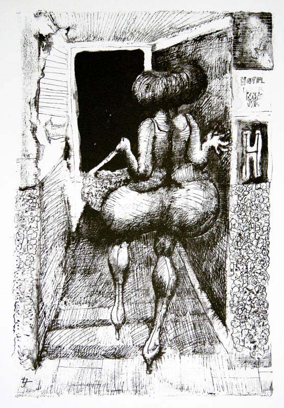 Jan Lebenstein (Brześć Litewski 1930 - Kraków 1999) w latach 1948-1954 studiował malarstwo w ASP w Warszawie pod kierunkiem prof. Eugeniusza Eibischa i Artura Nachta-Samborskiego. W 1955 wziął udział w wystawie w warszawskim Arsenale. Zaprzyjaźniony w czasie studiów z Mironem Białoszewskim, swą pierwszą wystawę indywidualną pokazał w 1956 w Teatrze na Tarczyńskiej. W 1959 zdobył Grand Prix de la Ville de Paris na I Biennale Młodych w Paryżu i w tym roku przeniósł się na stałe do Paryża. Po seriach "figur kreślonych" (na papierze milimetrowym) i "figur hieratycznych" z lat 1955-1958 maluje cykl "figur osiowych" (1958-1962), które wystawia w Paryżu i USA. Równolegle w 1960 zaczyna rysowane "karnety", rodzaj dziennika, który w przyszłości dostarczy motywów wykorzystanych w obrazach. W latach 1964-1965 maluje "Bestiarium", cykl fakturowych, archaizowanych stworów przypominających prehistoryczne wykopaliska. Bezpośrednio po nich wprowadza do swych obrazów postaci ludzkie i fantastyczne, odgrywające sceny ni to mitologiczne, ni to ze snu, często przesycone erotyką. W 1970 projektuje witraże dla Centre du Dialogue w Paryżu. W W 1971 otrzymuje obywatelstwo francuskie 1974 powstają gwasze inspirowane Folwarkiem zwierzęcym George'a Orwella. W latach 1976-1989 tworzy wyłącznie w technice gwaszu i pastelu, podejmując tematykę mitologiczną i zaczerpniętą z Biblii: cykle ilustracji do Księgi Hioba (wyd. 1979) i do Apokalipsy (wyd. 1986) w nowych przekładach Czesława Miłosza. W 1989 powraca do malarstwa olejnego (cykl "Pergamon"). Artysta otrzymał m. in. nagrodę Fundacji im. Alfreda Jurzykowskiego w 1976, Nagrodę Muzeum Archidiecezji Warszawskiej w 1985, Nagrodę im. Jana Cybisa w 1987.