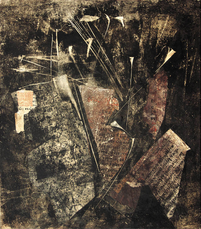 collage(nuty, stare druki i rękopisy, tusz, gwasz