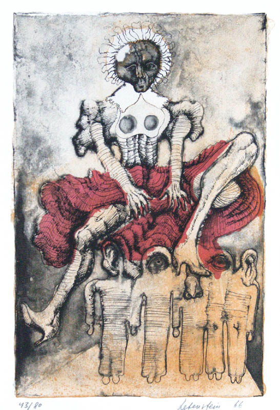 Jan Lebenstein (Brześć Litewski 1930 - Kraków 1999) w latach 1948-1954 studiował malarstwo w ASP w Warszawie pod kierunkiem prof. Eugeniusza Eibischa i Artura Nachta-Samborskiego. W 1955 wziął udział w wystawie w warszawskim Arsenale. Zaprzyjaźniony w czasie studiów z Mironem Białoszewskim, swą pierwszą wystawę indywidualną pokazał w 1956 w Teatrze na Tarczyńskiej. W 1959 zdobył Grand Prix de la Ville de Paris na I Biennale Młodych w Paryżu i w tym roku przeniósł się na stałe do Paryża. Po seriach "figur kreślonych" (na papierze milimetrowym) i "figur hieratycznych" z lat 1955-1958 maluje cykl "figur osiowych" (1958-1962), które wystawia w Paryżu i USA. Równolegle w 1960 zaczyna rysowane "karnety", rodzaj dziennika, który w przyszłości dostarczy motywów wykorzystanych w obrazach. W latach 1964-1965 maluje "Bestiarium", cykl fakturowych, archaizowanych stworów przypominających prehistoryczne wykopaliska. Bezpośrednio po nich wprowadza do swych obrazów postaci ludzkie i fantastyczne, odgrywające sceny ni to mitologiczne, ni to ze snu, często przesycone erotyką. W 1970 projektuje witraże dla Centre du Dialogue w Paryżu. W W 1971 otrzymuje obywatelstwo francuskie 1974 powstają gwasze inspirowane Folwarkiem zwierzęcym George'a Orwella. W latach 1976-1989 tworzy wyłącznie w technice gwaszu i pastelu, podejmując tematykę mitologiczną i zaczerpniętą z Biblii: cykle ilustracji do Księgi Hioba (wyd. 1979) i do Apokalipsy (wyd. 1986) w nowych przekładach Czesława Miłosza. W 1989 powraca do malarstwa olejnego (cykl "Pergamon"). Artysta otrzymał m. in. nagrodę Fundacji im. Alfreda Jurzykowskiego w 1976, Nagrodę Muzeum Archidiecezji Warszawskiej w 1985, Nagrodę im. Jana Cybisa w 1987.