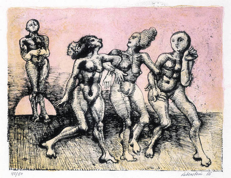 Jan Lebenstein (Brześć Litewski 1930 - Kraków 1999) w latach 1948-1954 studiował malarstwo w ASP w Warszawie pod kierunkiem prof. Eugeniusza Eibischa i Artura Nachta-Samborskiego. W 1955 wziął udział w wystawie w warszawskim Arsenale. Zaprzyjaźniony w czasie studiów z Mironem Białoszewskim, swą pierwszą wystawę indywidualną pokazał w 1956 w Teatrze na Tarczyńskiej. W 1959 zdobył Grand Prix de la Ville de Paris na I Biennale Młodych w Paryżu i w tym roku przeniósł się na stałe do Paryża. Po seriach "figur kreślonych" (na papierze milimetrowym) i "figur hieratycznych" z lat 1955-1958 maluje cykl "figur osiowych" (1958-1962), które wystawia w Paryżu i USA. Równolegle w 1960 zaczyna rysowane "karnety", rodzaj dziennika, który w przyszłości dostarczy motywów wykorzystanych w obrazach. W latach 1964-1965 maluje "Bestiarium", cykl fakturowych, archaizowanych stworów przypominających prehistoryczne wykopaliska. Bezpośrednio po nich wprowadza do swych obrazów postaci ludzkie i fantastyczne, odgrywające sceny ni to mitologiczne, ni to ze snu, często przesycone erotyką. W 1970 projektuje witraże dla Centre du Dialogue w Paryżu. W W 1971 otrzymuje obywatelstwo francuskie 1974 powstają gwasze inspirowane Folwarkiem zwierzęcym George'a Orwella. W latach 1976-1989 tworzy wyłącznie w technice gwaszu i pastelu, podejmując tematykę mitologiczną i zaczerpniętą z Biblii: cykle ilustracji do Księgi Hioba (wyd. 1979) i do Apokalipsy (wyd. 1986) w nowych przekładach Czesława Miłosza. W 1989 powraca do malarstwa olejnego (cykl "Pergamon"). Artysta otrzymał m. in. nagrodę Fundacji im. Alfreda Jurzykowskiego w 1976, Nagrodę Muzeum Archidiecezji Warszawskiej w 1985, Nagrodę im. Jana Cybisa w 1987.