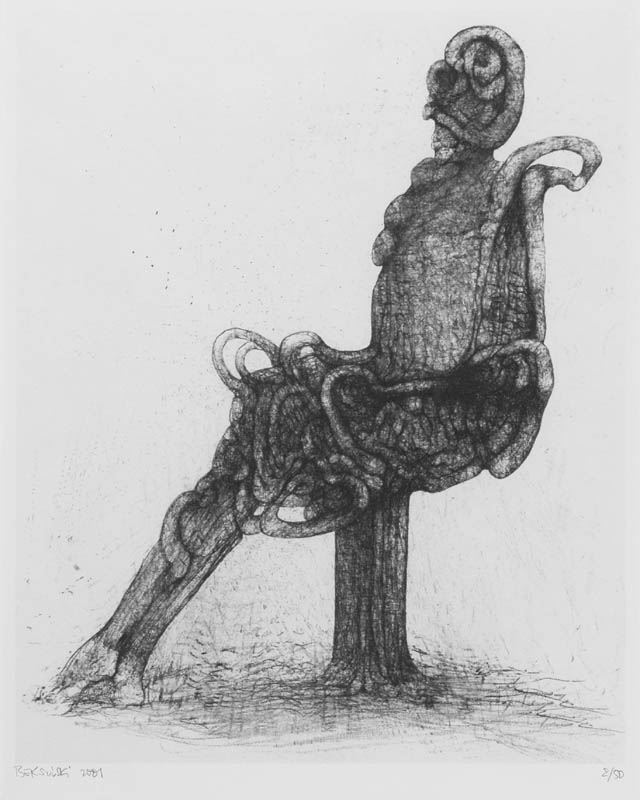 Zdzisław Beksiński (Sanok 24 II 1929 - Warszawa 21 II 2005) studiował w latach 1947-1952 na Wydziale Architektury Politechniki Krakowskiej. Był artystą samoukiem, który osiągnął niekwestionowaną pozycję w polskiej sztuce współczesnej, potwierdzoną obecnością jego prac na prestiżowych wystawach i w kolekcjach muzealnych. Początkowo zajmował się fotografią, którą interesował się od lat studenckich, po 1956 zyskując uznanie jako twórca fotogramów o estetyce opartej o efekty fakturowe. W latach 1958-1962 tworzył abstrakcyjne obrazy-reliefy o bogatej fakturze, głównie metalowe, będące odmianą malarstwa materii. Pod koniec tego okresu powstawały ażurowe formy o kształtach figur i pełnoplastyczne rzeźby w metalu. Kolejnym etapem jego twórczości były lata 1962-1974, kiedy poświęcał się głównie rysunkowi. W latach 60. rysował piórkiem i tuszem figuralne kompozycje odznaczające się karykaturalną deformacją postaci. Od końca lat 60. tworzył rysunki węglem i kredkami, będące monochromatyczną odmianą jego równoległej twórczości malarskiej. Od 1974 zajmował się niemal niepodzielnie malarstwem. Jego charakterystyczny styl bazował na perfekcji technicznej, której towarzyszyła niezwykłość wizji. Malował świat po katastrofie, naznaczony piętnem śmierci i rozpadu. Jego obrazy zaludniają postaci i stwory o ludzkich wprawdzie bądź zwierzęcych kształtach, lecz o cechach fantomów, automatów lub rozpadających się trucheł. Artysta nie nadawał swym obrazom i rysunkom tytułów (poza porządkującymi symbolami), akcentując w ten sposób swój brak zainteresowania dla literackiej strony przedstawień. Sam mówił, że malując całkowicie poddaje się wizji, „fotografuje“ ją. W ostatnich latach włączył do swego warsztatu artystycznego elektroniczne techniki generowania obrazu, które wykorzystywał do tworzenia komputerowych fotomontaży. Sztuka Beksińskiego, wielokrotnie wystawiana i omawiana, budzi skrajne emocje wśród znawców i publiczności.