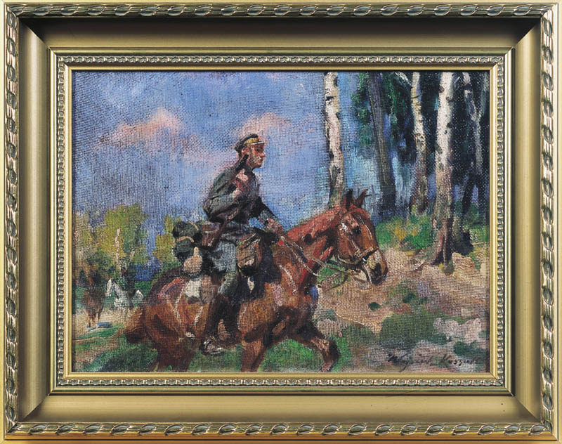 Wojciech Kossak (Paryż 1856 - Kraków 1942 ) – powszechnie znany malarz, postrzegany przede wszystkim jako świetny batalista. Syn i uczeń Juliusza Kossaka kształcił się w krakowskiej Szkole Sztuk Pięknych, w Akademii monachijskiej oraz w Paryżu. W latach 1895-1902 przebywał głównie w Berlinie, pracując dla cesarza Wilhelma II. Wiele podróżował, m.in. do Hiszpanii i Egiptu, gdzie wykonywał szkice do zamierzonych panoram. W późniejszych latach kilkakrotnie wyjeżdżał do Stanów Zjednoczonych wykonując zamówienia portretowe. W 1913 był mianowany profesorem warszawskiej Szkoły Sztuk Pięknych. W latach I wojny światowej pełnił służbę wojskową. Był współautorem panoram: „Racławice” (1893-1894), „Berezyna” (1895-1896), „Bitwa pod piramidami” (1901) oraz szkiców do niezrealizowanej „Somosierry” (1900). Z temperamentem i swobodą tworzył szeroko malowane, dynamiczne sceny batalistyczne, historyczne, rodzajowe oraz liczne portrety. Z upodobaniem malował konie. Jego obrazy, gloryfikujące dawne i współczesne artyście polskie wojsko i bohaterstwo żołnierzy, trafiały do patriotycznych uczuć odbiorców i cieszyły się ogromna popularnością.
