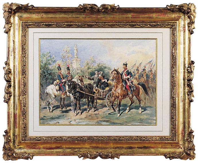 Juliusz Kossak (Wiśnicz 1824 - Kraków 1899) - malarz i ilustrator - był jednym z najpopularniejszych artystów polskich 2. połowy XIX wieku. Naukę rysunku i malarstwa rozpoczął we lwowskiej pracowni Jana Maszkowskiego; później wiele rysował z natury odwiedzając majątki szlacheckie na Ukrainie, Podolu i Wołyniu. W roku 1852 był w Wiedniu, na Węgrzech i w Petersburgu, a następnie zamieszkał na stałe w Warszawie. Lata 1856-1860 spędził w Paryżu, gdzie przyjaźnił się z Horacem Vernetem. Powróciwszy do Warszawy w latach 1862-1868 był kierownikiem artystycznym „Tygodnika Ilustrowanego”. W roku 1869 przeniósł się na stałe do Krakowa, skąd wyjeżdżał jeszcze do Monachium, by malować w atelier batalisty Franza Adama. Kossak był przede wszystkim znakomitym akwarelistą; rzadziej posługiwał się techniką olejną. Malował obrazy historyczne i batalistyczne, sceny rodzajowe ilustrujące życie i tradycje dworu szlacheckiego oraz obyczaje polskiego ludu. Ale prawdziwymi bohaterami jego obrazów były konie, których ruch, temperament, charakter i indywidualność potrafił po mistrzowsku przedstawić. Był także autorem wielu ilustracji do czasopism i książek, trafiającym bezbłędnie tak w klimat utworów literackich, jak i w tęsknoty i potrzeby odbiorców - czytelników Pieśni o ziemi naszej Wincentego Pola, Trylogii Henryka Sienkiewicza, Pana Tadeusza i poematów Adama Mickiewicza.