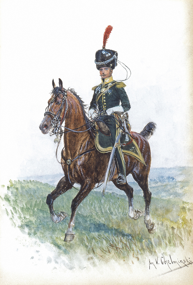 Jan Chełmiński (Brzustów k. Opoczna 1851 – Nowy Jork 1925) popularny malarz z kręgu „polskich monachijczyków“, naukę rozpoczął u Juliusza Kossaka, a następnie kształcił się w warszawskiej Klasie Rysunkowej oraz w Monachium - w Akademii u Alexandra Strähubera i Alexandra Wagnera (1873-1875) i prywatnych pracowniach Józefa Brandta (1875) i batalisty Franza Adama (1876). Po studiach przebywał już stale za granicą - w Monachium, Londynie (lata 1882, 1888-1899), Paryżu (1899), jeździł do Petersburga (1889) i Nowego Jorku (1884), gdzie później, około 1915 zamieszkał na stałe. Nie zerwał jednak kontaktów z krajem, a swoje prace często przesyłał na warszawskie wystawy. Jego obrazy cieszyły się ogromnym powodzeniem. Malował przede wszystkim sceny wojskowe i batalistycznie, najchętniej z czasów Księstwa Warszawskiego i wojen napoleońskich, a także obrazy rodzajowe i epizody z polowań. Zajmował się ilustracją książkową; m.in. ilustrował tom myśliwskich opowiadań Theodora Roosevelta. Był kolekcjonerem dawnej broni i wybitnym znawcą żołnierskiego umundurowania. Wiele obrazów artysty wciąż znajduje się za granicą - w Anglii, Niemczech czy Stanach Zjednoczonych. Nieliczne z nich pojawiają się w sprzedaży antykwarycznej, stale budząc żywe zainteresowanie zbieraczy.