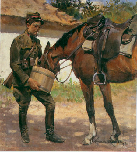 Wojciech Kossak (Paryż 1856 - Kraków 1942 ) – powszechnie znany malarz, postrzegany przede wszystkim jako świetny batalista. Syn i uczeń Juliusza Kossaka kształcił się w krakowskiej Szkole Sztuk Pięknych, w Akademii monachijskiej oraz w Paryżu. W latach 1895-1902 przebywał głównie w Berlinie, pracując dla cesarza Wilhelma II. Wiele podróżował, m.in. do Hiszpanii i Egiptu, gdzie wykonywał szkice do zamierzonych panoram. W późniejszych latach kilkakrotnie wyjeżdżał do Stanów Zjednoczonych wykonując zamówienia portretowe. W 1913 był mianowany profesorem warszawskiej Szkoły Sztuk Pięknych. W latach I wojny światowej pełnił służbę wojskową. Był współautorem panoram: „Racławice” (1893-1894), „Berezyna” (1895-1896), „Bitwa pod piramidami” (1901) oraz szkiców do niezrealizowanej „Somosierry” (1900). Z temperamentem i swobodą tworzył szeroko malowane, dynamiczne sceny batalistyczne, historyczne, rodzajowe oraz liczne portrety. Z upodobaniem malował konie. Jego obrazy, gloryfikujące dawne i współczesne artyście polskie wojsko i bohaterstwo żołnierzy, trafiały do patriotycznych uczuć odbiorców i cieszyły się ogromna popularnością.