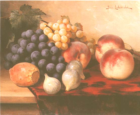 Prezentowany obraz jest jedną z niewielu zachowanych prac malarki Bronisławy Łukomskiej, od 1902 Wielowieyskiej, żony Tytusa Poraj-Wielowieyskiego. Artystka w latach 1884-1902 wielokrotnie uczestniczyła w wystawach w warszawskim Towarzystwie Zachęty Sztuk Pięknych. Malowała przede wszystkim martwe natury, często z owocami lub kwiatami, rzadziej portrety, charakterystyczne typy warszawskie (Tragarz zza Żelaznej Bramy, Cyganka wróżbiarka) oraz nieliczne sceny rodzajowe. Wystawiała także w Krakowie, Wilnie i we Lwowie, uczestniczyła w wystawach w Monachium, Berlinie i Pradze. W 1893 była w Paryżu. Do zamążpójścia mieszkała w Warszawie, później na wsi w majątku Sobień k.Opoczna, a w okresie międzywojennym ponownie w Warszawie. Liczne obrazy i szkice artystki spłonęły w czasie wojny, ona sama zginęła we wrześniu 1939 roku podczas bombardowania Warszawy.