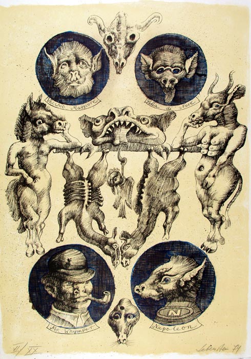 Jan Lebenstein (Brześć Litewski 1930 - Kraków 1999) w latach 1948-1954 studiował malarstwo w ASP w Warszawie pod kierunkiem prof. Eugeniusza Eibischa i Artura Nachta-Samborskiego. W 1955 wziął udział w wystawie w warszawskim Arsenale. Zaprzyjaźniony w czasie studiów z Mironem Białoszewskim, swą pierwszą wystawę indywidualną pokazał w 1956 w Teatrze na Tarczyńskiej. W 1959 zdobył Grand Prix de la Ville de Paris na I Biennale Młodych w Paryżu i w tym roku przeniósł się na stałe do Paryża. Po seriach "figur kreślonych" (na papierze milimetrowym) i "figur hieratycznych" z lat 1955-1958 maluje cykl "figur osiowych" (1958-1962), które wystawia w Paryżu i USA. Równolegle w 1960 zaczyna rysowane "karnety", rodzaj dziennika, który w przyszłości dostarczy motywów wykorzystanych w obrazach. W latach 1964-1965 maluje "Bestiarium", cykl fakturowych, archaizowanych stworów przypominających prehistoryczne wykopaliska. Bezpośrednio po nich wprowadza do swych obrazów postaci ludzkie i fantastyczne, odgrywające sceny ni to mitologiczne, ni to ze snu, często przesycone erotyką. W 1970 projektuje witraże dla Centre du Dialogue w Paryżu. W W 1971 otrzymuje obywatelstwo francuskie 1974 powstają gwasze inspirowane Folwarkiem zwierzęcym George'a Orwella. W latach 1976-1989 tworzy wyłącznie w technice gwaszu i pastelu, podejmując tematykę mitologiczną i zaczerpniętą z Biblii: cykle ilustracji do Księgi Hioba (wyd. 1979) i do Apokalipsy (wyd. 1986) w nowych przekładach Czesława Miłosza. W 1989 powraca do malarstwa olejnego (cykl "Pergamon"). Artysta otrzymał m. in. nagrodę Fundacji im. Alfreda Jurzykowskiego w 1976, Nagrodę Muzeum Archidiecezji Warszawskiej w 1985, Nagrodę im. Jana Cybisa w 1987.