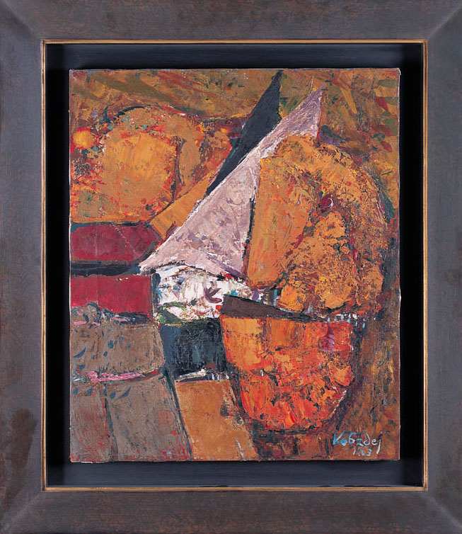 Aleksander Kobzdej (Olesko na Ukrainie 12 IX 1920 - Warszawa 25 IX 1972) od wczesnego dzieciństwa mieszkał we Lwowie, gdzie w 1939 zdał maturę. Równolegle z nauką w szkole średniej uczył się prywatnie rysunku i rzeźby. Jesienią 1939 rozpoczął studia architektoniczne na Politechnice Lwowskiej i jednocześnie zaczął malować pod okiem Władysława Lama. Pod obiema okupacjami, sowiecką i hitlerowską, podejmował prace zarobkowe, kontynuując w miarę możności studia. W 1944 został wywieziony na roboty przymusowe do Wiednia, skąd uciekł do Jugosławii. W 1945 wrócił do kraju. Krótko studiował w ASP w Krakowie u Eugeniusza Eibischa, by już pod koniec 1945 objąć stanowisko asystenta swego dawnego nauczyciela, Władysława Lama, na Wydziale Architektury Politechniki Gdańskiej. Pracując ukończył politechnikę z dyplomem inżyniera i od 1947 zaczął uczyć w PWSSP w Sopocie. Pracował tam do 1951, kiedy to przeniósł się do ASP w Warszawie, gdzie nauczał aż do śmierci. W latach 40. ulegał w swych próbach malarskich wpływom koloryzmu, kierunku triumfującego zarówno w Akademii krakowskiej, gdzie zaczynał studia, jak i w „szkole sopockiej“, w której sam uczył. Koloryzm Kobzdeja był jednakże poddany dyscyplinie skupionej, syntetycznej formy o rodowodzie sięgającym kubizmu i ekspresjonizmu. W pierwszej połowie lat 50. Kobzdej należał do koryfeuszy socrealizmu. Na ile artysta nie unikał, nawet w tym czasie, ironicznej refleksji, świadczy dyptyk złożony z obrazów Podaj cegłę i Ceglarki, w którym skonfrontował postulatywną i rzeczywistą stronę trudu codziennej pracy. W latach 50. rozwinął też swój talent rysownika, tworząc cykle reportażowych notatek z podróży do Chin i Wietnamu. Od 1956 radykalnie zmienił styl, doświadczając odtąd rozmaitych odmian informelu i malarstwa materii. Eksperymentując z fakturą i przestrzenią doszedł do swego głównego motywu, m stał się wielki cykl „Szczelin“, tworzonych od 1966. Ich syntezą stały się obiekty malarskie zwane „Hors cadre“.