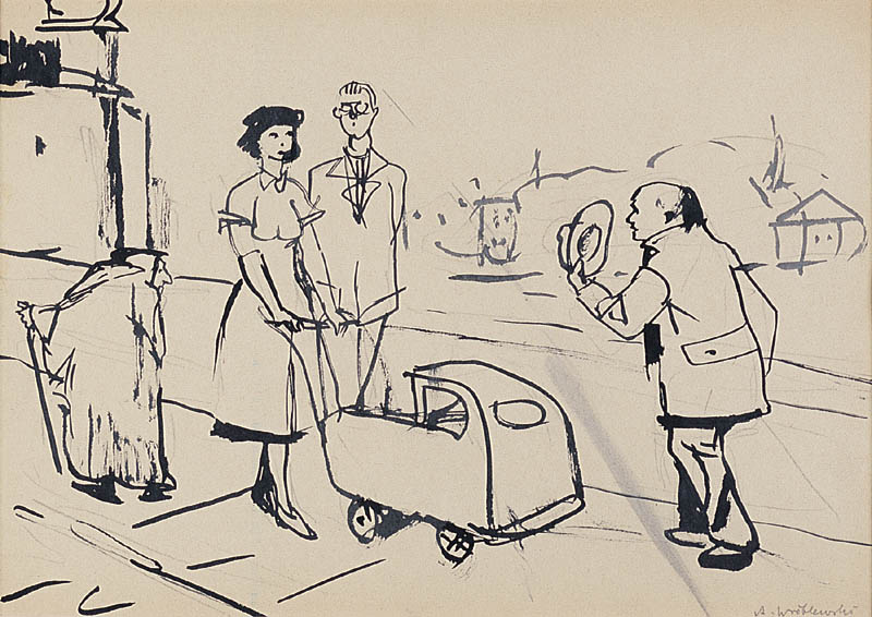 Od 1950 Wróblewski pracował jako asystent, następnie aspirant w macierzystej uczelni (do 1955). Próbował - bez powodzenia - poddać się dyscyplinie realizmu socjalistycznego. W 1955 wziął udział w wystawie w warszawskim Arsenale. Z ostatnich lat twórczości artysty pochodzą najważniejsze, poza „Rozstrzelaniami“, jego dzieła: Kolejka trwa, Ukrzesłowienia, Szofer - wszystkie z 1956. Ważnym wątkiem jego twórczości były prace na papierze: liczne akwarele, rysunki, monotypie.