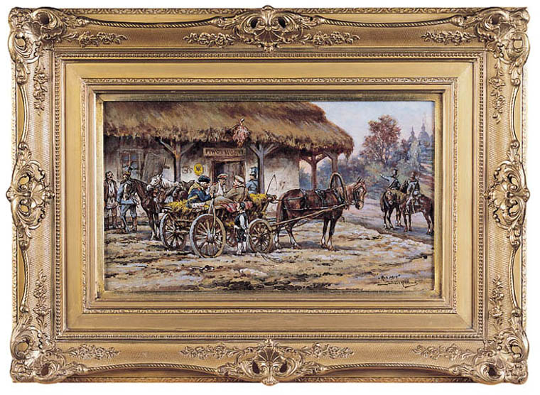 Tadeusz Rybkowski (Kielce 1848 - Lwów 1926) Tadeusz Rybkowski studia malarskie rozpoczął pod kierunkiem Władysława Łuszczkiewicza w krakowskiej Szkole Sztuk Pięknych. Następnie, w latach 1875-1877, kształcił się w Wiedniu - w Akademii Sztuk Pięknych oraz w pracowniach Leopolda Loefflera i Hansa Makarta. W Wiedniu pozostał na dłużej, wyjeżdżając stamtąd w podróże do Włoch, Monachium, Drezna i Berlina. W roku 1893 osiadł na stałe we Lwowie; założył prywatną szkołę malarstwa dla kobiet, wykładał też w Państwowej Szkole Przemysłowej. Malował olejno i akwarelą, głównie sceny rodzajowe - polowania, targi, jarmarki. Interesował się folklorem huculskim, zajmował się malarstwem ściennym, wykonywał ilustracje do czasopism.