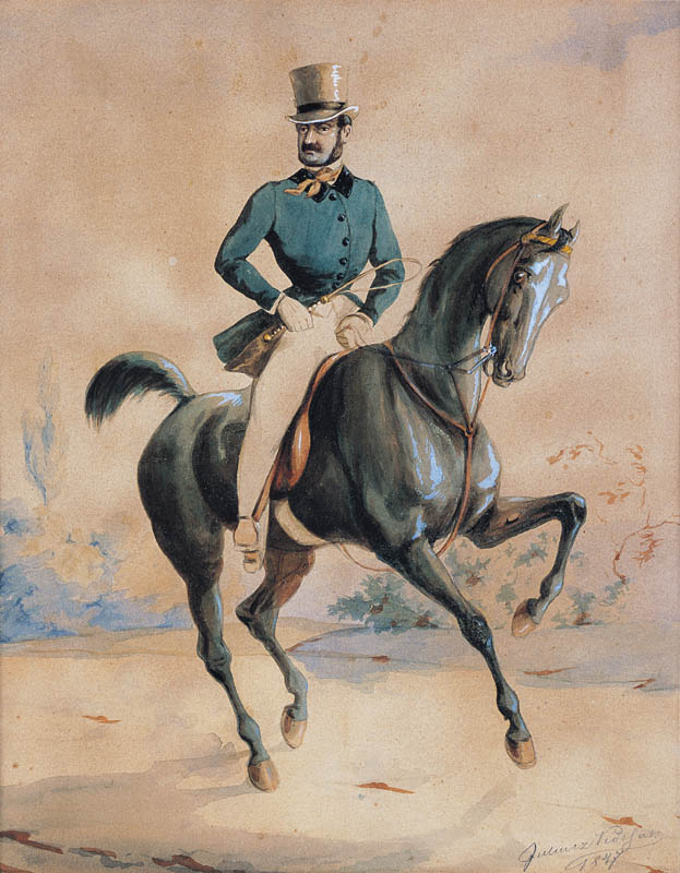 Juliusz Kossak (Wiśnicz 1824 - Kraków 1899) - malarz i ilustrator - był jednym z najpopularniejszych artystów polskich 2. połowy XIX wieku. Naukę rysunku i malarstwa rozpoczął we lwowskiej pracowni Jana Maszkowskiego; później wiele rysował z natury odwiedzając majątki szlacheckie na Ukrainie, Podolu i Wołyniu. W roku 1852 był w Wiedniu, na Węgrzech i w Petersburgu, a następnie zamieszkał na stałe w Warszawie. Lata 1856-1860 spędził w Paryżu, gdzie przyjaźnił się z Horacem Vernetem. Powróciwszy do Warszawy w latach 1862-1868 był kierownikiem artystycznym „Tygodnika Ilustrowanego”. W roku 1869 przeniósł się na stałe do Krakowa, skąd wyjeżdżał jeszcze do Monachium, by malować w atelier batalisty Franza Adama. Kossak był przede wszystkim znakomitym akwarelistą; rzadziej posługiwał się techniką olejną. Malował obrazy historyczne i batalistyczne, sceny rodzajowe ilustrujące życie i tradycje dworu szlacheckiego oraz obyczaje polskiego ludu. Ale prawdziwymi bohaterami jego obrazów były konie, których ruch, temperament, charakter i indywidualność potrafił po mistrzowsku przedstawić. Był także autorem wielu ilustracji do czasopism i książek, trafiającym bezbłędnie tak w klimat utworów literackich, jak i w tęsknoty i potrzeby odbiorców - czytelników Pieśni o ziemi naszej Wincentego Pola, Trylogii Henryka Sienkiewicza, Pana Tadeusza i poematów Adama Mickiewicza.