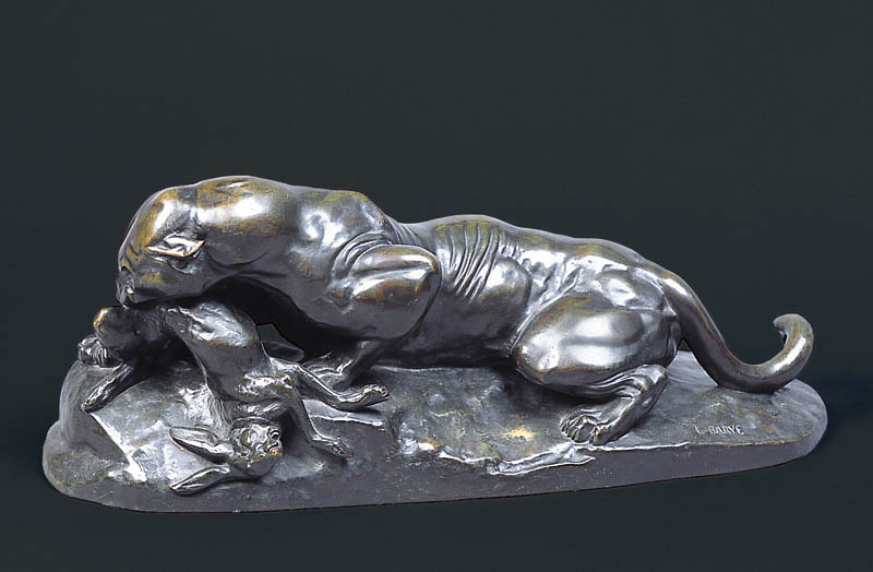 Antoine-Louis Barye - jeden z najwybitniejszych francuskich rzeźbiarzy romantycznych; naukę pobierał u grawera, pracował też u słynnego złotnika Biennais. Przez krótki czas uczęszczał do pracowni Bossio i Grosa. W latach 1818-1825 studiował w paryskiej École des Beaux-Arts. Zasłynął kompozycjami animalistycznymi, najczęściej o niewielkich wymiarach. Potrafił wypowiadać się też w dużych formatach, np. figura św. Klotyldy w kościele św. Magdaleny w Paryżu, konny posąg Napoleona I w Ajaccio, ukończone w 1856 r. cztery grupy - wspomniana Wojna oraz Pokój, Ład i Władza - na fasadzie nowego Luwru.(Opr. Ryszard Bobrow)