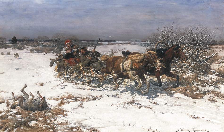 Alfred Wierusz-Kowalski (Suwałki 1849 – Monachium 1915) - jeden z najwybitniejszych polskich malarzy tzw. szkoły monachijskiej był, obok Józefa Brandta i Władysława Czachórskiego, także najpopularniejszym z polskich artystów osiadłych i stale działających w Monachium. Zamieszkał tam w roku 1873, już po studiach w Warszawie i w Dreźnie. Przez rok uczył się jeszcze w monachijskiej Akademii Sztuk Pięknych pod kierunkiem Alexandra Wagnera, a następnie przeniósł się do prywatnej pracowni Brandta. Uznanie krytyki i publiczności zdobył wcześnie; jego obrazy, odznaczane medalami na wystawach były rozchwytywane przez kolekcjonerów i niemieckich handlarzy. W roku 1890 został honorowym profesorem Akademii monachijskiej. Malował sceny rodzajowe i rodzajowo-historyczne z motywami jeźdźców, rycerzy, myśliwych, koni, wilków i śniegów. Po podróży do Afryki w roku 1903 podejmował też tematy orientalne. W polskich zbiorach muzealnych znalazło się stosunkowo niewiele prac artysty – jego obrazy sprzedawane głównie na rynku niemieckim w większej liczbie trafiały do kolekcji prywatnych, głównie w Niemczech i Stanach Zjednoczonych. Obecne często pojawiają się i na polskim rynku sztuki, zawsze budząc zainteresowanie kolekcjonerów.