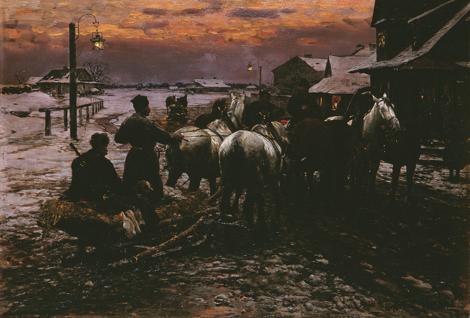 Alfred Wierusz-Kowalski (Suwałki 1849 – Monachium 1915) - jeden z najwybitniejszych polskich malarzy tzw. szkoły monachijskiej był, obok Józefa Brandta i Władysława Czachórskiego, także najpopularniejszym z polskich artystów osiadłych i stale działających w Monachium. Zamieszkał tam w roku 1873, już po studiach w Warszawie i w Dreźnie. Przez rok uczył się jeszcze w monachijskiej Akademii Sztuk Pięknych pod kierunkiem Alexandra Wagnera, a następnie przeniósł się do prywatnej pracowni Brandta. Uznanie krytyki i publiczności zdobył wcześnie; jego obrazy, odznaczane medalami na wystawach były rozchwytywane przez kolekcjonerów i niemieckich handlarzy. W roku 1890 został honorowym profesorem Akademii monachijskiej. Malował sceny rodzajowe i rodzajowo-historyczne z motywami jeźdźców, rycerzy, myśliwych, koni, wilków i śniegów. Po podróży do Afryki w roku 1903 podejmował też tematy orientalne. W polskich zbiorach muzealnych znalazło się stosunkowo niewiele prac artysty – jego obrazy sprzedawane głównie na rynku niemieckim w większej liczbie trafiały do kolekcji prywatnych, głównie w Niemczech i Stanach Zjednoczonych. Obecne często pojawiają się i na polskim rynku sztuki, zawsze budząc zainteresowanie kolekcjonerów.