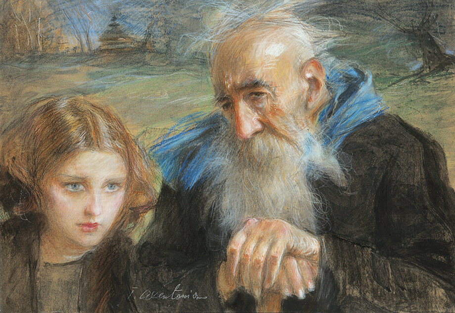 Teodor Axentowicz (Braszów w Siedmiogrodzie 1859 - Kraków 1938) – malarz, pastelista, litograf – był jednym z najbardziej znanych i cenionych malarzy polskich. Kształcił się w Akademii Sztuk Pięknych w Monachium pod kierunkiem Gabriela Hackla, Aleksandra Wagnera, Gyuli Benczúra. Studia uzupełniał w Paryżu, gdzie następnie przebywał przez lat kilkanaście. Brał udział w paryskich Salonach; w 1890 otrzymał członkostwo Société Nationale des Beaux-Arts. W tym czasie wielokrotnie wyjeżdżał również do Londynu. W 1895 powrócił do kraju i zamieszkał na stałe w Krakowie, powołany na profesora tamtejszej Szkoły Sztuk Pięknych (od 1900 Akademii). W uczelni tej nauczał nieprzerwanie do 1934, dwukrotnie pełniąc funkcję rektora (lata 1910-11 oraz 1927-28). Był jednym z członków-założycieli Towarzystwa Artystów Polskich „Sztuka”, członkiem wiedeńskiej „Secesji” i współpracownikiem jej pisma „Ver Sacrum”. Powodzenie przyniosły mu zwłaszcza idealizowane wizerunki wytwornych dam oraz wdzięczne portrety dziecięce. Malował też obrazy o tematyce rodzajowej; był jednym z pierwszych malarzy Huculszczyzny i Hucułów. Tworzył obrazy historyczne i kompozycje symboliczne związane z upływem czasu, przemijaniem, starością. We wczesnym, monachijskim okresie były to obrazy utrzymane w duchu akademickiego realizmu; na późniejszą twórczość artysty wywarło wpływ angielskie malarstwo XVIII w. oraz dzieła malarzy współczesnych - Boldoniego, Whistlera, Sargenta. Jego obrazy cechuje dekoracyjność, elegancja, świeżość subtelnej gamy kolorów i delikatna secesyjna stylizacja. Początkowo malował olejno i akwarelą, a po 1890 przede wszystkim mistrzowsko opanowaną techniką pastelu. Zajmował się ilustratorstwem i litografią, projektował plakaty wystaw „Sztuki”.