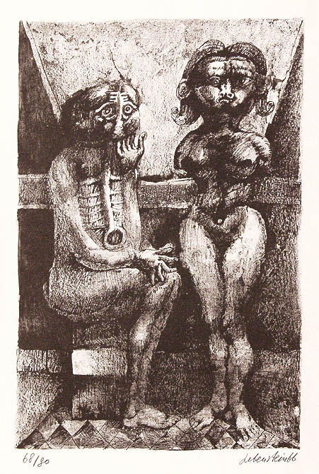 Jan Lebenstein (Brześć Litewski 1930 - Kraków 1999) w latach 1948-1954 studiował malarstwo w ASP w Warszawie pod kierunkiem prof. Eugeniusza Eibischa i Artura Nachta-Samborskiego. W 1955 wziął udział w wystawie w warszawskim Arsenale. Zaprzyjaźniony w czasie studiów z Mironem Białoszewskim, swą pierwszą wystawę indywidualną pokazał w 1956 w Teatrze na Tarczyńskiej. W 1959 zdobył Grand Prix de la Ville de Paris na I Biennale Młodych w Paryżu i w tym roku przeniósł się na stałe do Paryża. Po seriach "figur kreślonych" (na papierze milimetrowym) i "figur hieratycznych" z lat 1955-1958 maluje cykl "figur osiowych" (1958-1962), które wystawia w Paryżu i USA. Równolegle w 1960 zaczyna rysowane "karnety", rodzaj dziennika, który w przyszłości dostarczy motywów wykorzystanych w obrazach. W latach 1964-1965 maluje "Bestiarium", cykl fakturowych, archaizowanych stworów przypominających prehistoryczne wykopaliska. Bezpośrednio po nich wprowadza do swych obrazów postaci ludzkie i fantastyczne, odgrywające sceny ni to mitologiczne, ni to ze snu, często przesycone erotyką. W 1970 projektuje witraże dla Centre du Dialogue w Paryżu. W W 1971 otrzymuje obywatelstwo francuskie 1974 powstają gwasze inspirowane Folwarkiem zwierzęcym George'a Orwella. W latach 1976-1989 tworzy wyłącznie w technice gwaszu i pastelu, podejmując tematykę mitologiczną i zaczerpniętą z Biblii: cykle ilustracji do Księgi Hioba (wyd. 1979) i do Apokalipsy (wyd. 1986) w nowych przekładach Czesława Miłosza. W 1989 powraca do malarstwa olejnego (cykl "Pergamon"). Artysta otrzymał m. in. nagrodę Fundacji im. Alfreda Jurzykowskiego w 1976, Nagrodę Muzeum Archidiecezji Warszawskiej w 1985, Nagrodę im. Jana Cybisa w 1987.