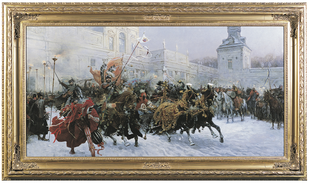 Oferowany obraz ma jednak kompozycję odmienną – przedstawia sanie, zaprząg i cały orszak w ujęciu bocznym, w bliższym, ciaśniejszym kadrze, obejmującym tylko część pałacowej fasady. Saniami jedzie sama królowa Marysieńka, bez męża, za to w towarzystwie damy dworu. I choć niektóre postaci i rekwizyty są takie same (np. skrzydlaty husarz, rozwiana chorągiew, bogate czapraki), to wydaje się, że więcej tu fantazji, temperamentu i dynamiki. Wrażenie szybkiego ruchu artysta spotęgował poprzez wyraźny skontrastowanie grupy rozpędzonych koni, biegnących mężczyzn – masztalerza i trefnisia – ze statycznym oddziałem konnych i rzędem dworzan z pochodniami. Niektóre, szkicowo opracowane partie obrazu dodatkowo podnoszą jeszcze owo wrażenie ruchu i nasilają ekspresję.