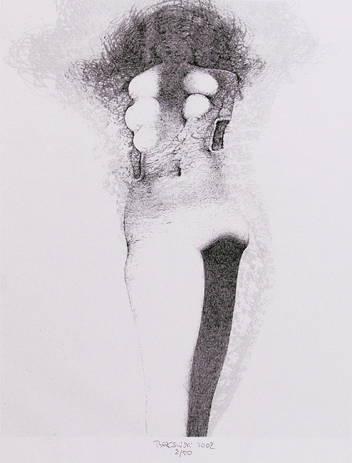 Zdzisław Beksiński (Sanok 24 II 1929 - Warszawa 21 II 2005) studiował w latach 1947-1952 na Wydziale Architektury Politechniki Krakowskiej. Był artystą samoukiem, który osiągnął niekwestionowaną pozycję w polskiej sztuce współczesnej, potwierdzoną obecnością jego prac na prestiżowych wystawach i w kolekcjach muzealnych. Początkowo zajmował się fotografią, którą interesował się od lat studenckich, po 1956 zyskując uznanie jako twórca fotogramów o estetyce opartej o efekty fakturowe. W latach 1958-1962 tworzył abstrakcyjne obrazy-reliefy o bogatej fakturze, głównie metalowe, będące odmianą malarstwa materii. Pod koniec tego okresu powstawały ażurowe formy o kształtach figur i pełnoplastyczne rzeźby w metalu. Kolejnym etapem jego twórczości były lata 1962-1974, kiedy poświęcał się głównie rysunkowi. W latach 60. rysował piórkiem i tuszem figuralne kompozycje odznaczające się karykaturalną deformacją postaci. Od końca lat 60. tworzył rysunki węglem i kredkami, będące monochromatyczną odmianą jego równoległej twórczości malarskiej. Od 1974 zajmował się niemal niepodzielnie malarstwem. Jego charakterystyczny styl bazował na perfekcji technicznej, której towarzyszyła niezwykłość wizji. Malował świat po katastrofie, naznaczony piętnem śmierci i rozpadu. Jego obrazy zaludniają postaci i stwory o ludzkich wprawdzie bądź zwierzęcych kształtach, lecz o cechach fantomów, automatów lub rozpadających się trucheł. Artysta nie nadawał swym obrazom i rysunkom tytułów (poza porządkującymi symbolami), akcentując w ten sposób swój brak zainteresowania dla literackiej strony przedstawień. Sam mówił, że malując całkowicie poddaje się wizji, „fotografuje“ ją. W ostatnich latach włączył do swego warsztatu artystycznego elektroniczne techniki generowania obrazu, które wykorzystywał do tworzenia komputerowych fotomontaży. Sztuka Beksińskiego, wielokrotnie wystawiana i omawiana, budzi skrajne emocje wśród znawców i publiczności.
