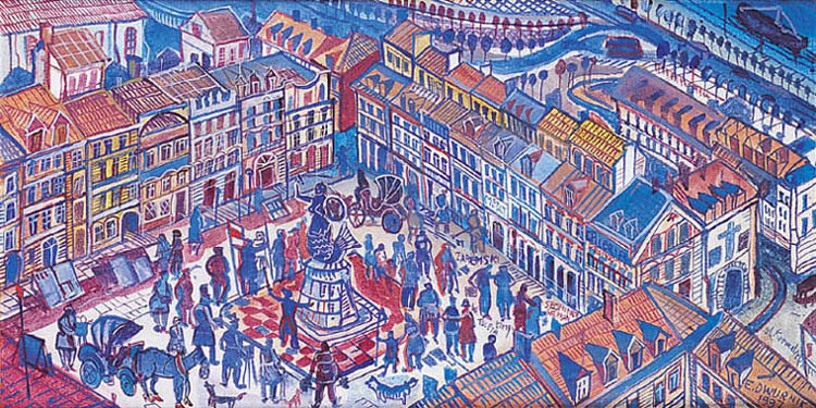 Edward Dwurnik (Radzymin 19 IV 1943 - Warszawa 28 X 2018) studiował malarstwo w ASP w Warszawie (1963-1970), jednak jako swego „mistrza“ wymienia Nikifora. Jego to prace, zobaczone po raz pierwszy w 1965, zainspirowały ówczesnego studenta III roku do narysowania pierwszych prac z cyklu „Podróże autostopem“, które kontynuował w nastepnych latach. W 1972-1978 powstawał cykl „Sportowcy“, w którym portretowane były, dodajmy - kąśliwie, typowe postaci z lat 70. Równolegle od 1975 powstawał cykl „Robotnicy“, który kulminował w okresie „Solidarności“ 1980-1981. Za prace z tego cyklu Dwurnik otrzymał w 1981 Nagrodę Krytyki Artystycznej im. Cypriana Kamila Norwida, natomiast za obrazy z cyklu „Warszawa“ (1981), proroczo zapowiadające stan wojenny - Nagrodę Kulturalną „Solidarności“ podziemnej w 1983. W latach 80. malarstwo Dwurnika przybrało wyraz ekspresyjny i dramatyczny. Powstające w tej dekadzie obrazy miały niejednokrotnie wymowę polityczną, przybierały też kostium historyczny, tak czy inaczej odnoszący się do współczesnych spraw i realiów. Cykl „Droga na Wschód“ (1989-91) upamiętniał ofiary stalinizmu, natomiast cykl „Od Grudnia do Czerwca“ (1990-94) - ofiary stanu wojennego. Zarówno ideowe, jak i czysto malarskie walory tych prac przyniosły artyście ogromne uznanie, zarówno w kraju jak i za granicą. Jego wyrazem była prestiżowa nagroda Fundacji Coutts & Co w Zurychu (1992). W latach 90. powstają cykle będące kontynuacją „Podróży autostopem“: „Niebieskie miasta“ (od 1993) i „Diagonale“ (od 1996), jak również kompozycje nowego typu, jak widoki morskie (cykl „Błękitne“, 1992-93) czy cykl „Wyliczanka“ (1996-99). Artysta wiele wystawia, miał ok. 100 wystaw indywidualnych w Polsce i za granicą, brał też udział w licznych wystawach i festiwalach krajowych i międzynarodowych, m.in.: X Biennale Sztuki Współczesnej, Menton 1974, Documenta 7, Kassel 1982, 5th Biennale, Sydney 1985, XIX Biennale Sztuki, Sao Paulo 1987; Olimpiada Sztuki, Seul 1988. Równolegle z malarstwem uprawiał rysunek, collage, grafikę warsztatową (litografia, techniki metalowe, kserografia, stemple) i użytkową (ilustracja, plakaty do własnych wystaw indywidualnych).