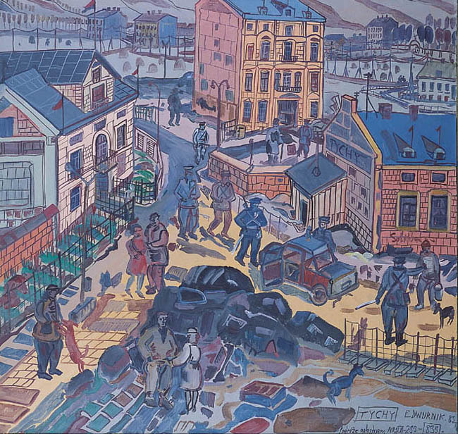 Edward Dwurnik (Radzymin 19 IV 1943 - Warszawa 28 X 2018) studiował malarstwo w ASP w Warszawie (1963-1970), jednak jako swego „mistrza“ wymienia Nikifora. Jego to prace, zobaczone po raz pierwszy w 1965, zainspirowały ówczesnego studenta III roku do narysowania pierwszych prac z cyklu „Podróże autostopem“, które kontynuował w nastepnych latach. W 1972-1978 powstawał cykl „Sportowcy“, w którym portretowane były, dodajmy - kąśliwie, typowe postaci z lat 70. Równolegle od 1975 powstawał cykl „Robotnicy“, który kulminował w okresie „Solidarności“ 1980-1981. Za prace z tego cyklu Dwurnik otrzymał w 1981 Nagrodę Krytyki Artystycznej im. Cypriana Kamila Norwida, natomiast za obrazy z cyklu „Warszawa“ (1981), proroczo zapowiadające stan wojenny - Nagrodę Kulturalną „Solidarności“ podziemnej w 1983. W latach 80. malarstwo Dwurnika przybrało wyraz ekspresyjny i dramatyczny. Powstające w tej dekadzie obrazy miały niejednokrotnie wymowę polityczną, przybierały też kostium historyczny, tak czy inaczej odnoszący się do współczesnych spraw i realiów. Cykl „Droga na Wschód“ (1989-91) upamiętniał ofiary stalinizmu, natomiast cykl „Od Grudnia do Czerwca“ (1990-94) - ofiary stanu wojennego. Zarówno ideowe, jak i czysto malarskie walory tych prac przyniosły artyście ogromne uznanie, zarówno w kraju jak i za granicą. Jego wyrazem była prestiżowa nagroda Fundacji Coutts & Co w Zurychu (1992). W latach 90. powstają cykle będące kontynuacją „Podróży autostopem“: „Niebieskie miasta“ (od 1993) i „Diagonale“ (od 1996), jak również kompozycje nowego typu, jak widoki morskie (cykl „Błękitne“, 1992-93) czy cykl „Wyliczanka“ (1996-99). Artysta wiele wystawia, miał ok. 100 wystaw indywidualnych w Polsce i za granicą, brał też udział w licznych wystawach i festiwalach krajowych i międzynarodowych, m.in.: X Biennale Sztuki Współczesnej, Menton 1974, Documenta 7, Kassel 1982, 5th Biennale, Sydney 1985, XIX Biennale Sztuki, Sao Paulo 1987; Olimpiada Sztuki, Seul 1988. Równolegle z malarstwem uprawiał rysunek, collage, grafikę warsztatową (litografia, techniki metalowe, kserografia, stemple) i użytkową (ilustracja, plakaty do własnych wystaw indywidualnych).